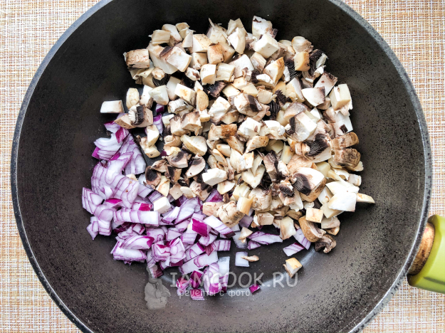 Мелко нарежьте лук и шампиньоны. Обжарьте на подсолнечном масле до мягкости лука. Затем переложите в тарелку.