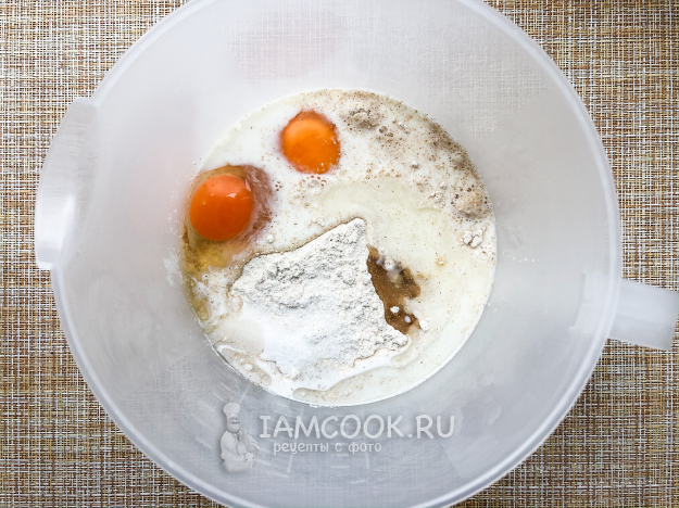 Все ингредиенты для блинов: яйца, муку, молоко, подсолнечное масло, сахар и соль соедините в одной глубокой миске и тщательно перемешайте, чтобы не было комочков.