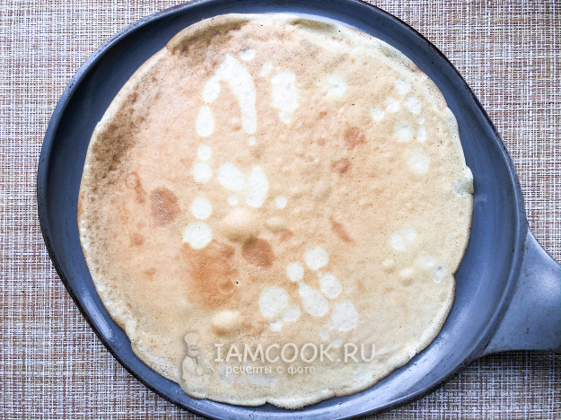 Далее испеките все блины, 1 половник теста на каждый блин. Перед каждым блином сковороду немного смазывайте подсолнечным маслом.