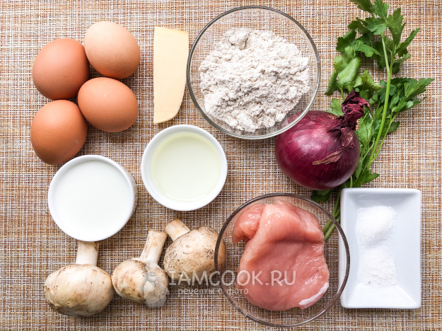 Для приготовления блинов из цельнозерновой муки с индейкой и грибами необходимы следующие ингредиенты.