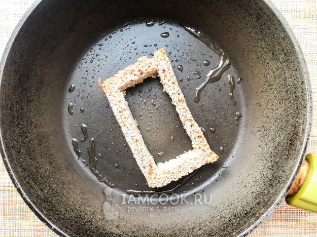 Из хлеба вырежьте середину, оставив края в 1 сантиметр. Сковороду смажьте подсолнечным маслом и выложите хлеб. Поджаривайте около минуты.