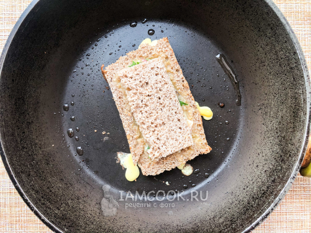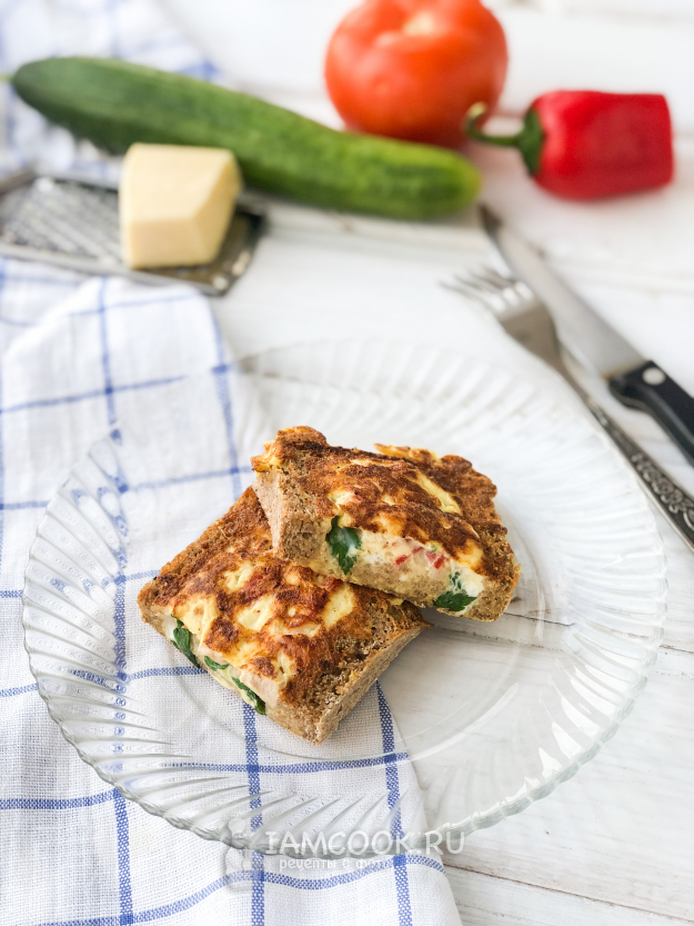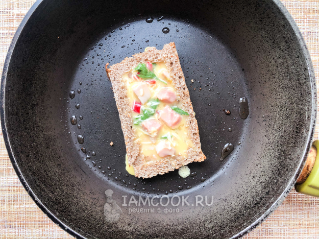 Сверху накройте кусочком хлеба, который вырезали до этого.