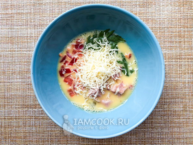 Добавьте мелко нарезанный перец, петрушку, куриный рулет и натертый на мелкой терке сыр. Тщательно перемешайте.
