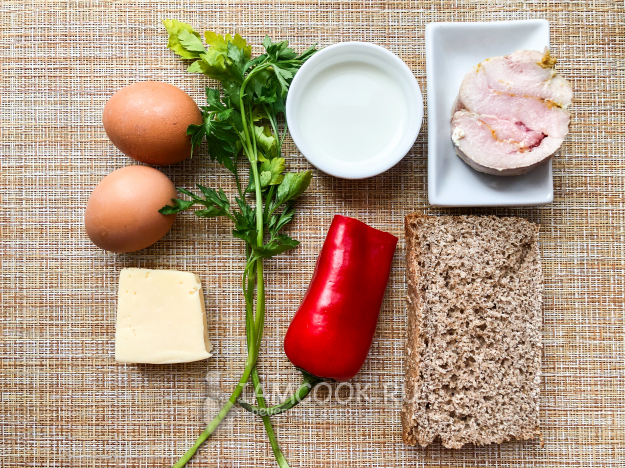 Для приготовления омлета с куриным рулетом в хлебе возьмите ингредиенты по списку.