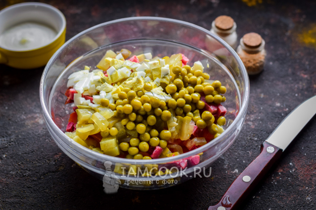 Куриное яйцо нарезать аналогично другим ингредиентам, добавить в салат вместе с консервированным горошком.