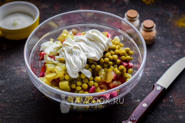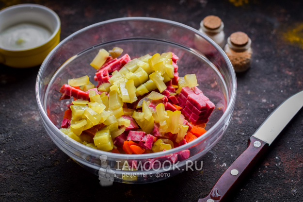 Соленые огурцы измельчить кубиками, добавить в салат.