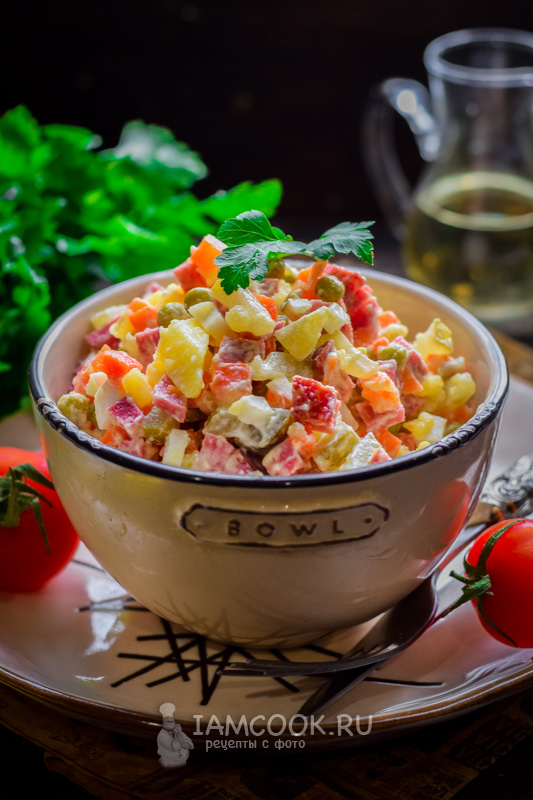 Заправить все сметаной или майонезом, соль и перец добавить по вкусу, перемешать всё - салат «Столичный» с копченой колбасой готов. Можно подавать к столу.