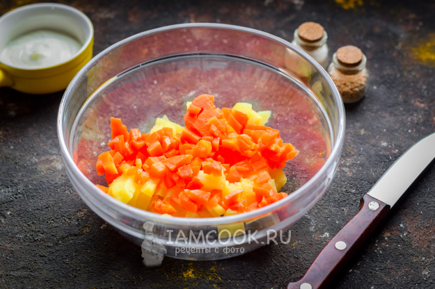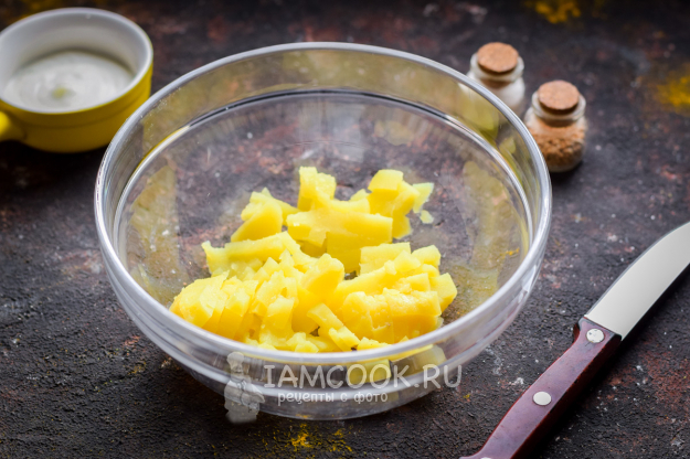 Очистить картофель, нарезать небольшими по размеру кубиками. Переложить картофель в салатник.