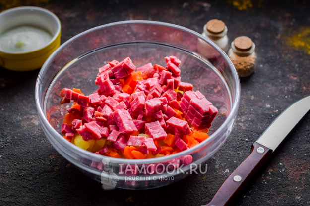 Копченую колбасу также нарезать небольшими кубиками, добавить в салат.