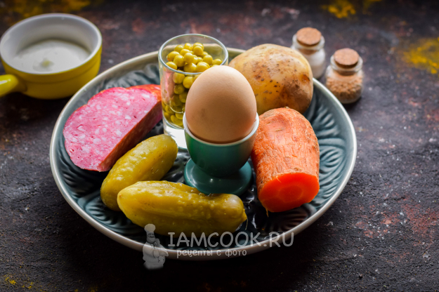 Подготовить все необходимые продукты для салата «Столичный» с копченой колбасой. Картофель, морковь и яйцо отварить до готовности.
