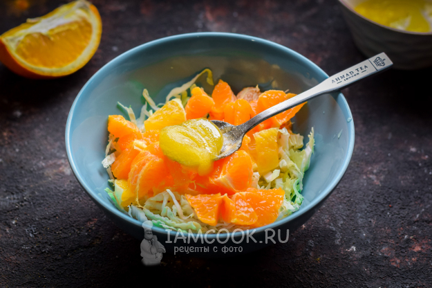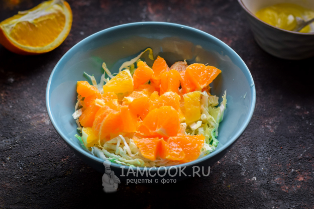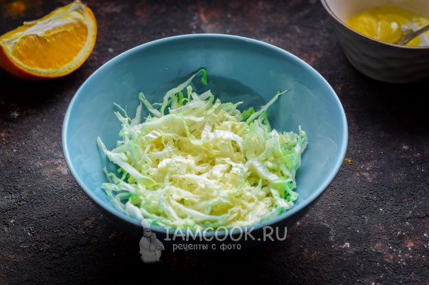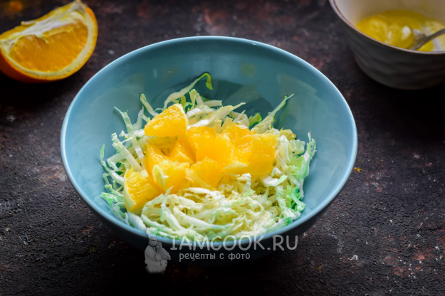 Апельсин очистить от кожуры, нарезать кубиками и добавить к капусте.