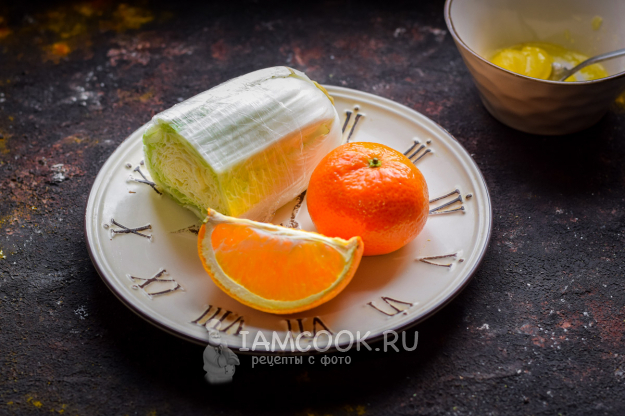 Подготовить продукты для салата с пекинской капустой, апельсином и мандарином. По желанию мед можно заменить любым сиропом, или щепоткой сахара.