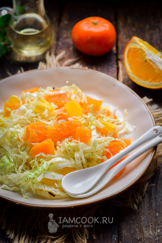 Мандарин очистить и нарезать кубиками, косточки удалить. Добавить мандарины в салат.