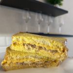 Второй кусочек хлеба обмакните во взбитое яйцо и положите сверху на сыр. Если вы делаете два сэндвича, то сразу же соберите вторую заготовку и отправьте их в разогретую до 170 градусов духовку на 5-7 минут.