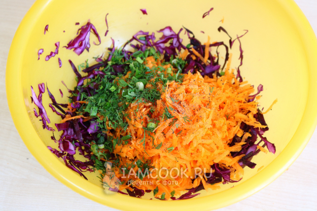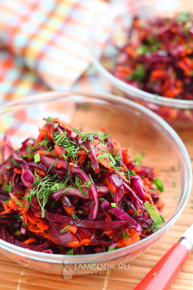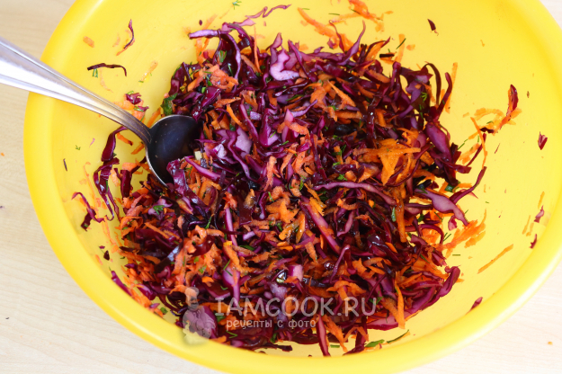 Салат из красной капусты с морковью готов! Подаём к столу сразу порционно или в красивом блюде. Приятного аппетита!