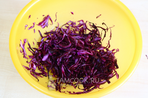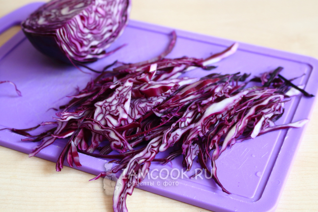 Краснокочанную капусту очищаем от верхних вялых листов и тонко-тонко шинкуем ножом.