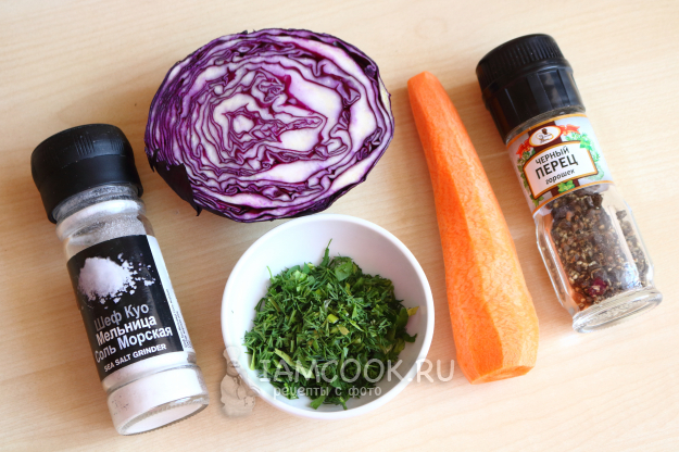 Для приготовления салата из краснокочанной капусты с морковью возьмём следующие ингредиенты.