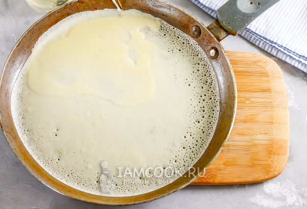 Прогрейте сковороду для блинов и влейте порцию теста, сразу же прокручивая сковороду в воздухе, чтобы тесто описало по дну круг. Выпекайте блин примерно 1 минуту с одной стороны, затем переверните с помощью силиконовой лопатки на другую сторону и выпекайте еще 1 минуту. Таким образом испеките и остальные блинчики.