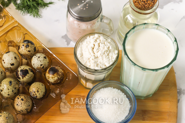 Итак, подготовьте необходимые ингредиенты для блинов на перепелиных яйцах и молоке и начнем кулинарить!