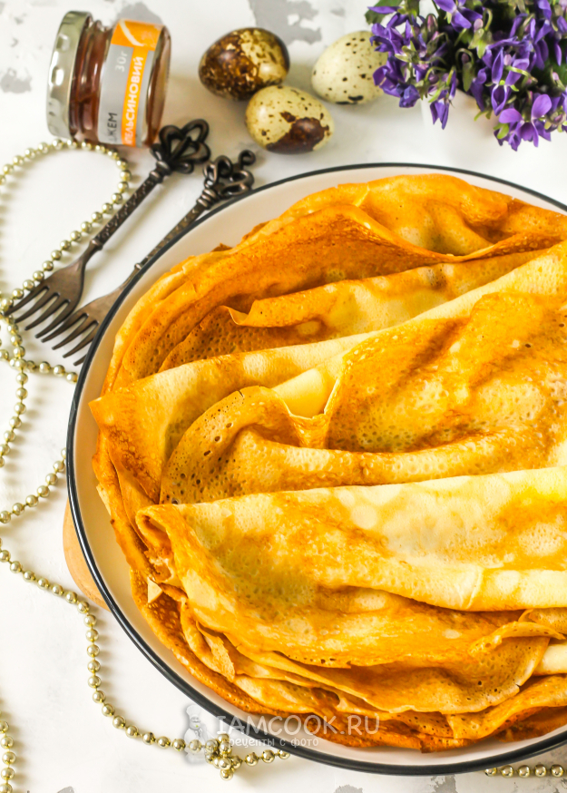 Блины на перепелиных яйцах и молоке готовы, выложите их на тарелку и подайте к столу теплыми. Созовите родных на чаепитие, заранее заварив ароматный чай либо кофе.