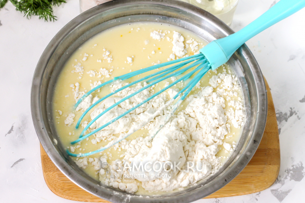 Всыпьте пшеничную муку и еще раз все взбейте так, чтобы в тесте не образовались комочки. Влейте растительное масло и перемешайте, оставьте блинное тесто на 15-20 минут (обязательно!), чтобы активировалась клейковина. Затем перемешайте его еще раз, поднимая муку со дна.