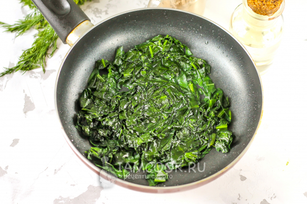 Обжарьте в оставшемся растительном масле нарезанный промытый шпинат с щепоткой соли примерно 2 минуты. Помните, что зелень теряет в массе при термической обработке примерно вчетверо.