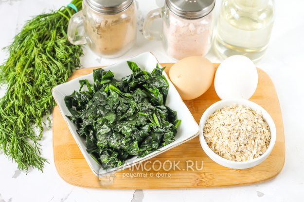 Возьмите ингредиенты для приготовления овсяноблина с начинкой из шпината и начнем кулинарить! Я использую замороженный шпинат, который заготовила летом, вы же можете приобрести свежий, промыть его и срезать стебельки.