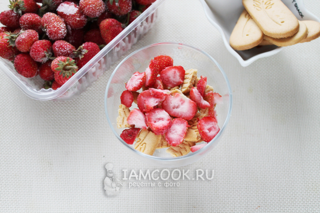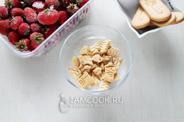 В креманку раскрошим печенье. В идеале англичане используют сухой бисквит, но его вполне заменит любое другое печенье, есть много рецептов вообще без выпечки. В данном случае я беру хрустящее молочное злаковое печенье.