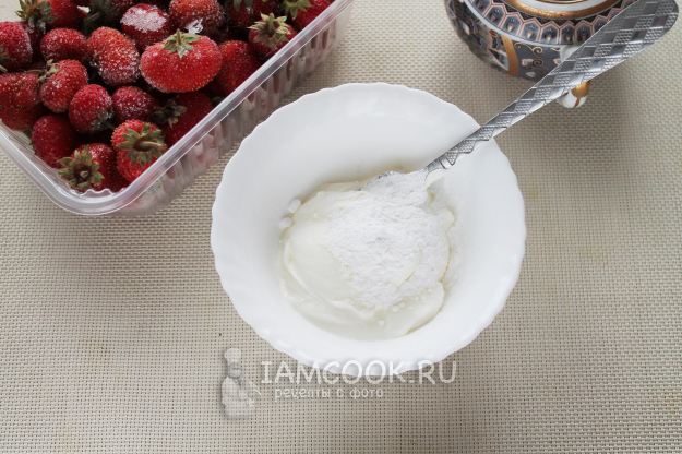 Сначала приготовим сметанный крем на основе сахарной пудры. В мисочку выложим сметану и пудру (можно заменить сахаром, но тогда подольше взбивайте, чтобы он растворился).