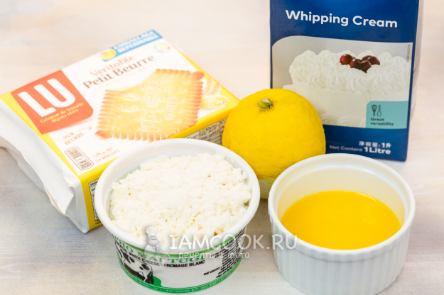 Ингредиенты для приготовления творожно-сливочного десерта с печеньем без выпечки подготовьте по списку.
