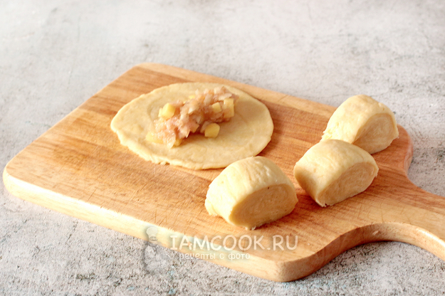 Сделайте из теста толстый жгут и нарежьте на кусочки. Каждый кусочек теста раскатайте в лепешку. В центр выложите мясную начинку.
