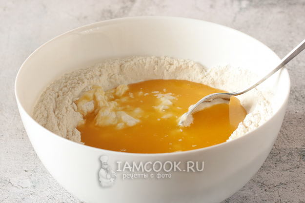 Сделайте в центре лунку и влейте кефир и растопленное масло.
