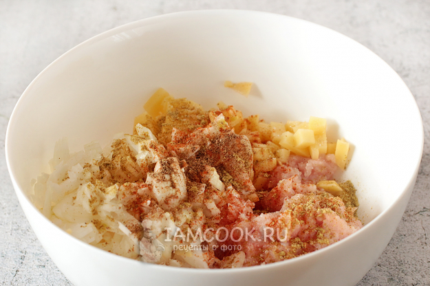 Для начинки соедините куриное филе, мелко нарубленный лук и так же мелко нарезанный картофель.