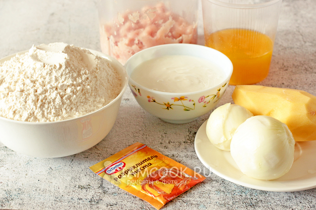 Подготовьте все необходимые составляющие для пирожков на песочном тесте с курицей и картофелем. Кефир берите густой.