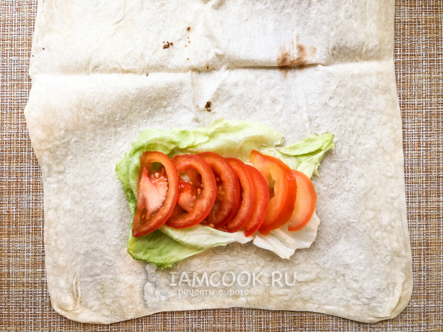 На край лаваша выложите лист айсберга, на него - половину помидора.