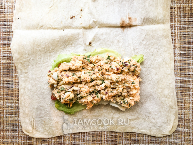 Сверху выложите половину рыбного салата. Заверните нижний край лаваша, затем боковые края, и далее сверните в рулет.