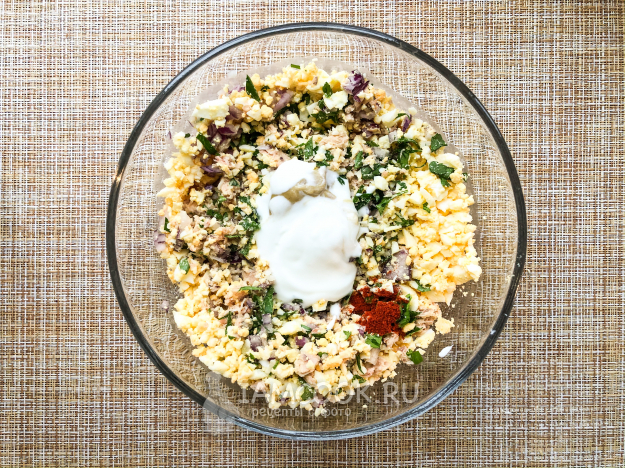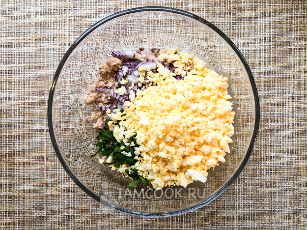 Остывшие яйца измельчите и добавьте в общую миску.
