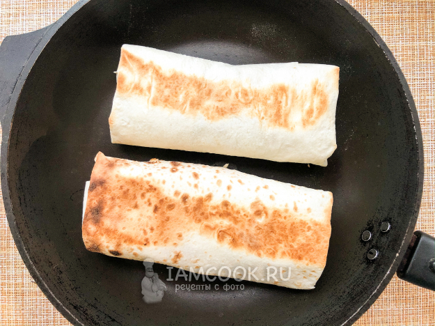 Повторите процесс сборки ролла со вторым листом лаваша. На сухой сковороде обжарьте оба ролла с обеих сторон до легкой золотистой корочки.