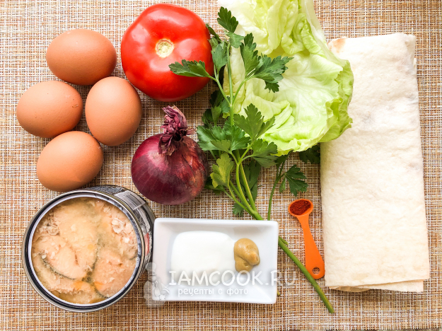 Для приготовления лаваша с консервированной горбушей и яйцом понадобятся следующие ингредиенты.