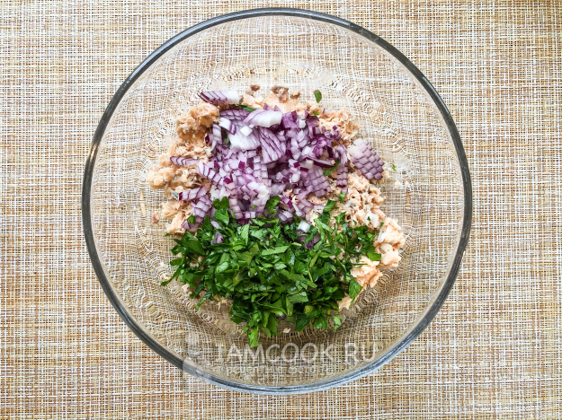 Мелко нарежьте красный лук и петрушку. Добавьте к рыбе.