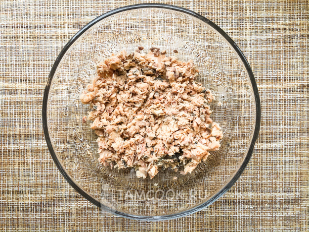 Из рыбы извлеките косточки и разомните вилкой.
