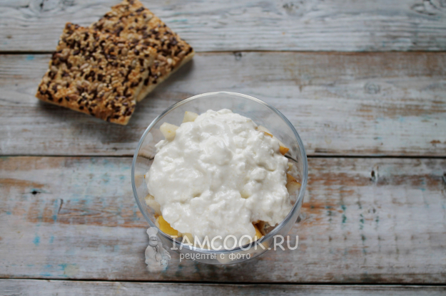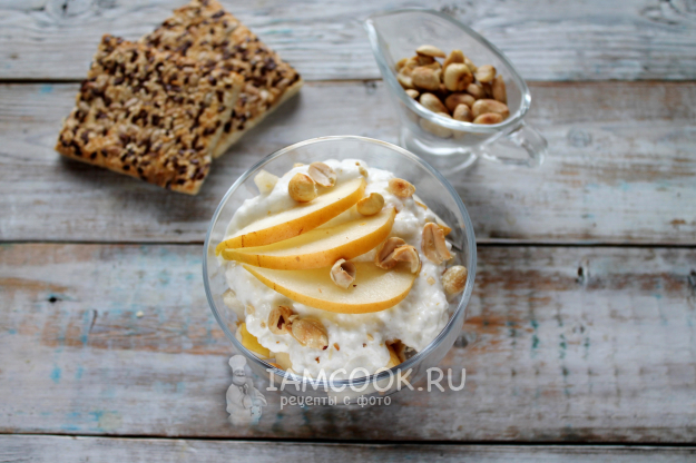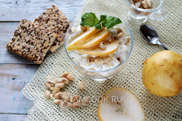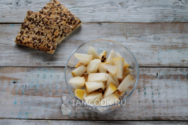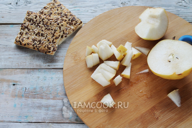 Грушу хорошо вымоем и нарежем кубиком, на одну порцию хватит половинки плода среднего размера.