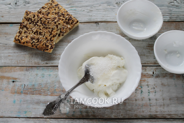 Сначала подготовим связующую творожную массу. Смешаем хороший творог со сметаной и сахаром. Если у вас жирный и влажный творог или зерненый, то сметану можно и не брать.