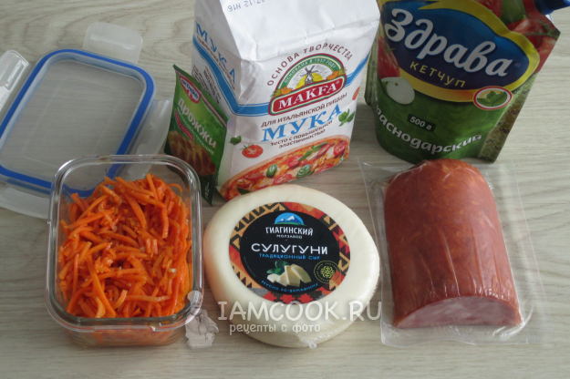 Для пиццы с ветчиной и морковью по-корейски подготовьте ингредиенты по списку к рецепту.