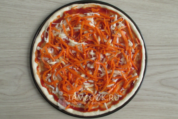 Смажьте поверхность заготовки кетчупом, посыпьте примерно половиной сыра, уложите морковку по-корейски.