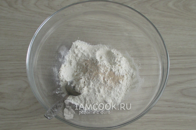 Сначала определитесь, какой у вас вид сухих дрожжей (для смешивания с мукой или для растворения в жидкостях). У меня - для соединения с мукой, поэтому сначала перемешиваю сухие дрожжи с мукой, солью и сахаром.