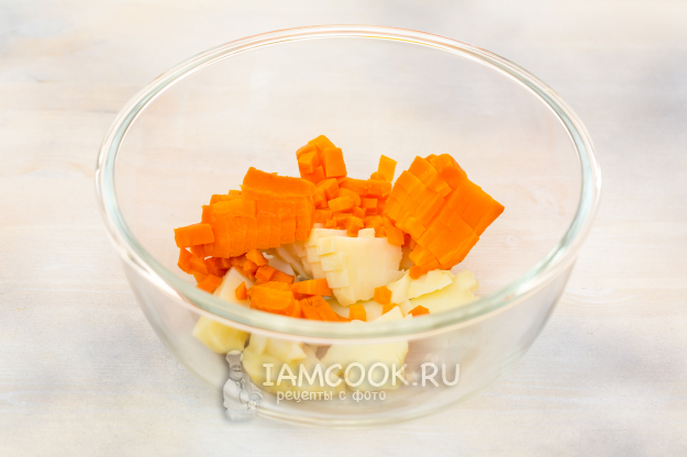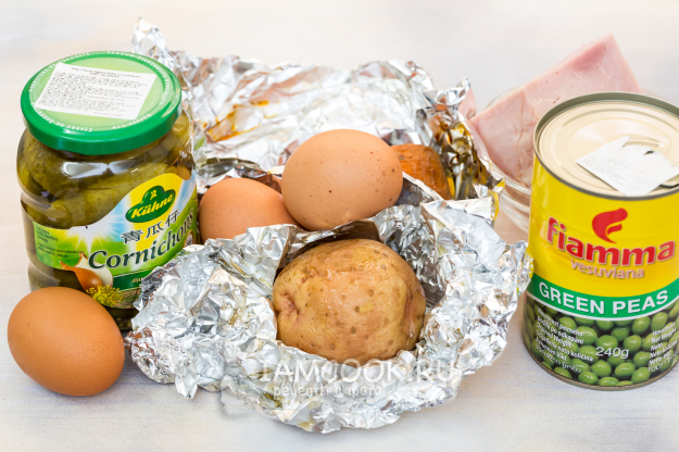 Если вы заранее подготовите продукты, то времени на приготовление салата уйдет совсем немного. Картофель и морковь я заранее запекаю в фольге в духовке, яйца отвариваю тоже накануне.