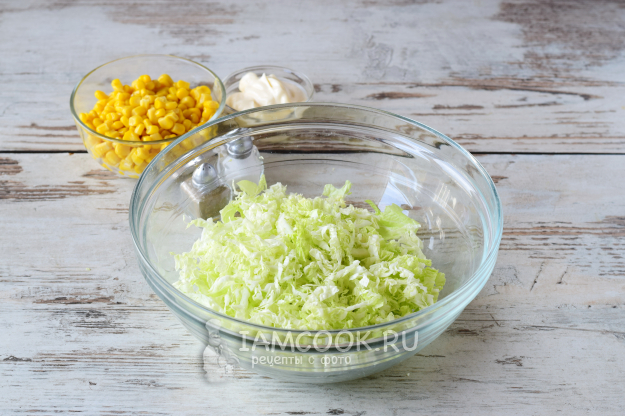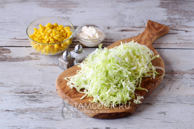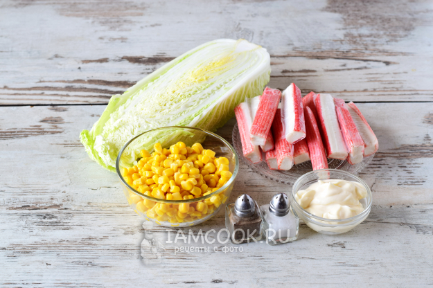 Подготовим все ингредиенты для салата «Глория» с крабовыми палочками и капустой.