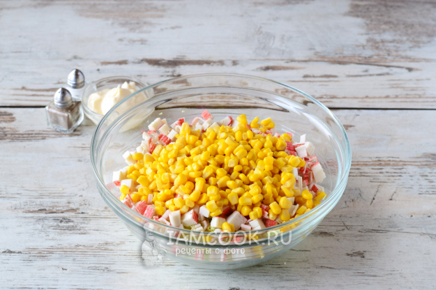С консервированной кукурузы сливаем жидкость и добавляем зерна в салат.