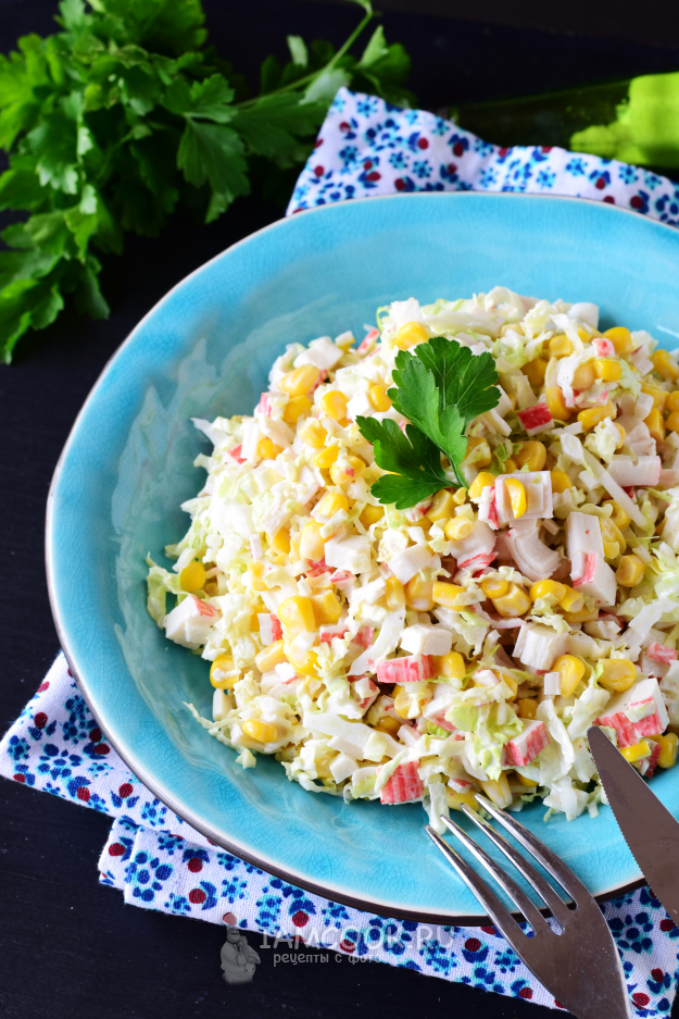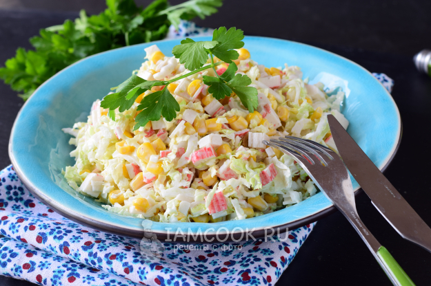 Мне этот крабовый салат попался на глаза под названием «Глория». Его особенность - в добавлении капусты, белокочанной или пекинской (получается вкусно в обоих вариантах).